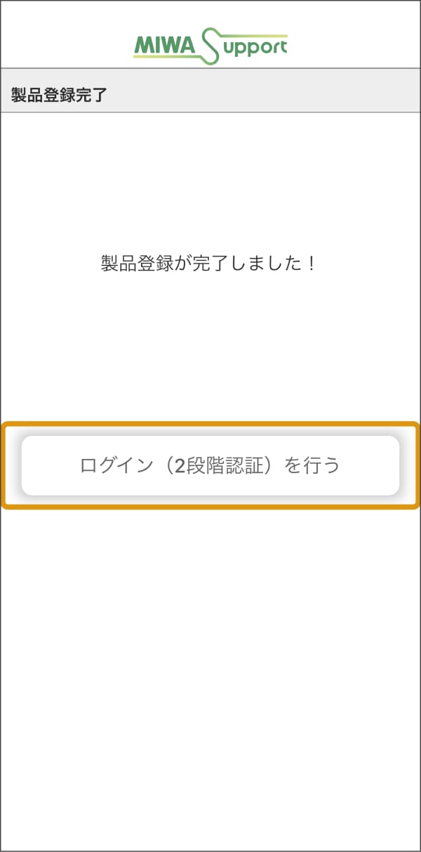③-4. [製品登録が完了しました!]と表示されたら、製品登録は完了です。[ログイン(2段階認証)を行う]をタップして2段階認証を行ってから、中継器の製品登録をしてください。
