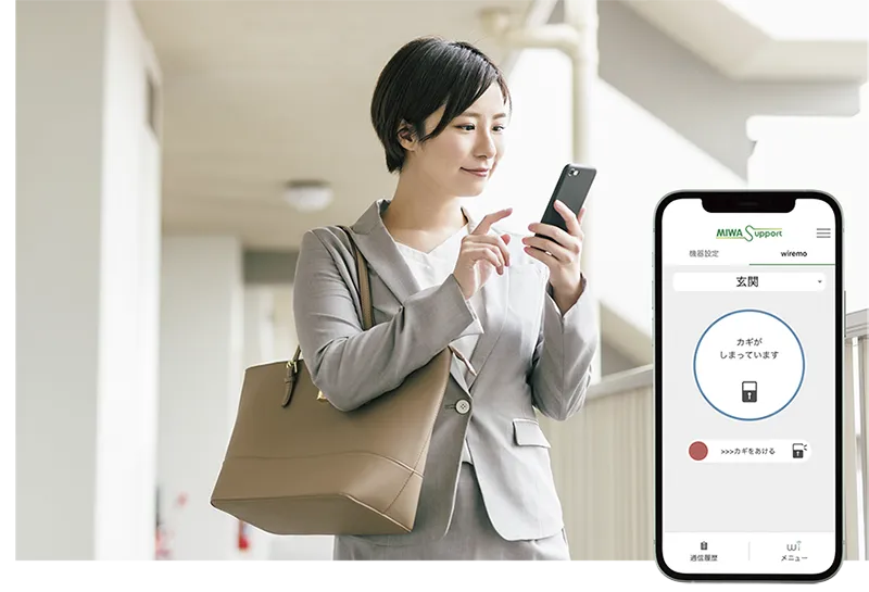 また、ご自宅の玄関錠をMIWA Supportアプリの操作で、施錠・解錠することもできます。この機能をご利用いただくためには、wiremoサービスの契約が必要です。