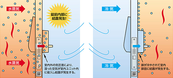 スマートロックの中は電子部品でいっぱい。電子部品は一般的に水に弱いものです。最近の住まいは室内が1年中快適な環境ですが、室内外の境にあるスマートロックは常に結露と戦っています。湿った空気が電子部品に届く環境が常態化すると、電子部品の腐食などを招き、早期故障につながります。